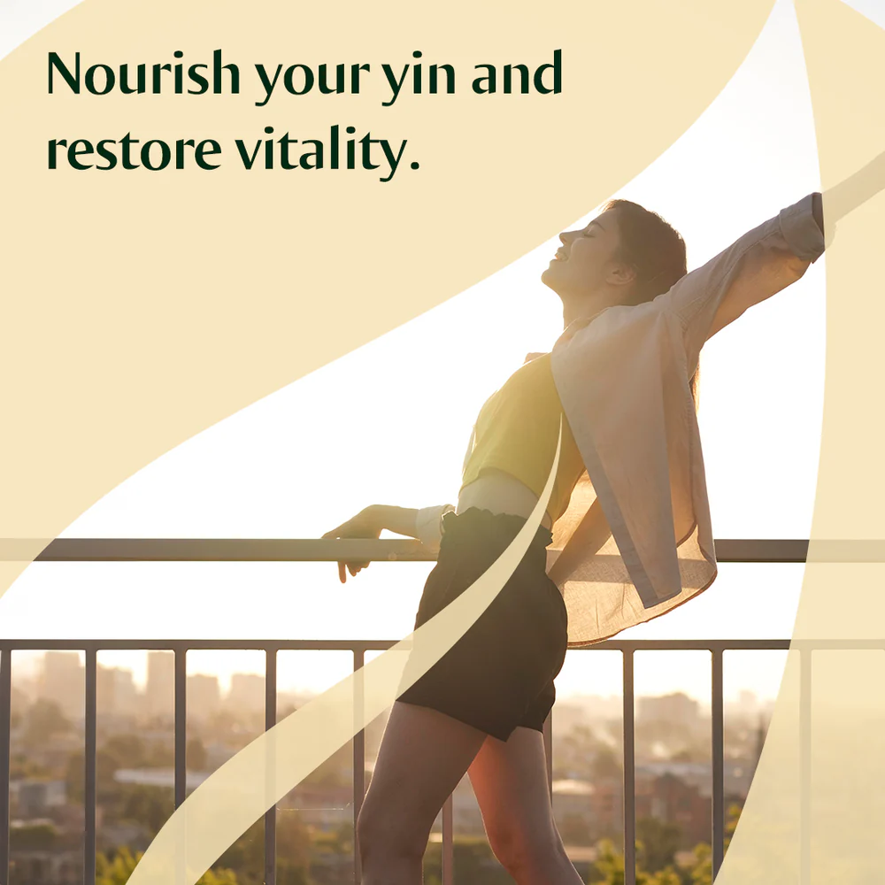 Indication: Indicated for Kidney Yin Deficiency: Weakness in the lower back/knees/lower limbs, thirst (sips/sleep), facial redness, heat in the five centers, dry stools, low urine output, night sweats.