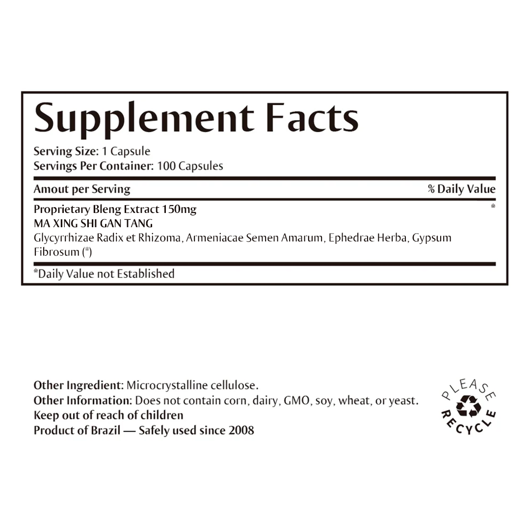 Indication: Indicated for Lung Heat whether or not resulting from a Superficial Syndrome: Cough with green and/or yellow phlegm accompanied or not by Bronchospasms (Pneumonia, Bronchopneumonia).