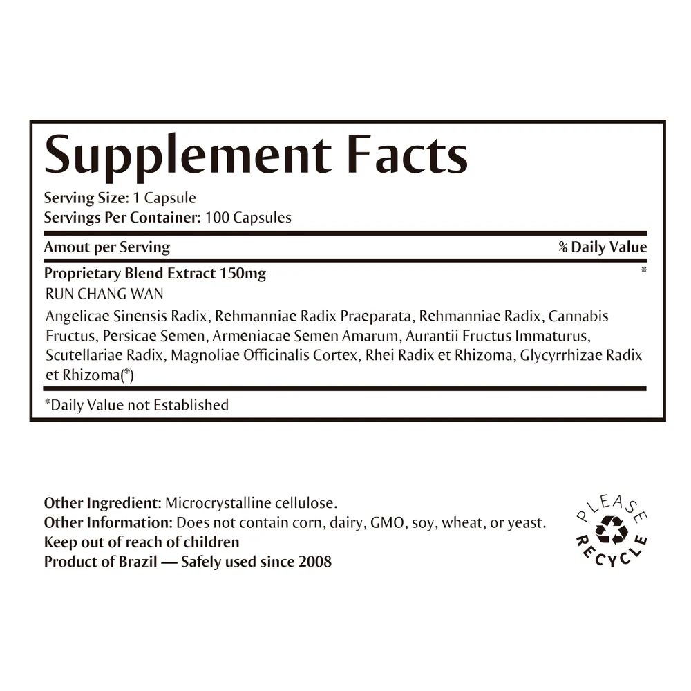 Indication: Indicated for Large Intestine JinYe Dryness: Chronic constipation (dry, non-hardened stools, without difficulty in evacuation) – Elderly, Convalescence, Chronic wasting diseases, Post-surgical, Postpartum.