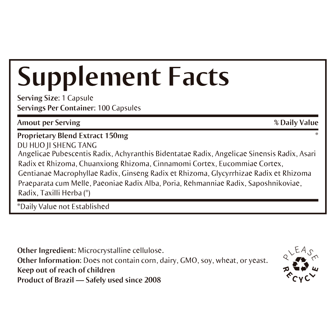 Indication: Recommended for Bi Syndrome with Kidney (Yang) Deficiency/Cold-Dampness in the Lower Limbs: Low back pain, sciatica, arthralgia.